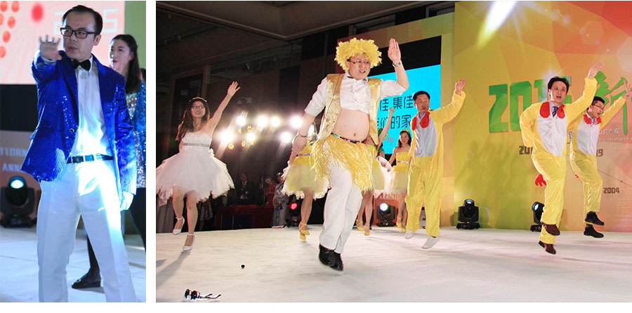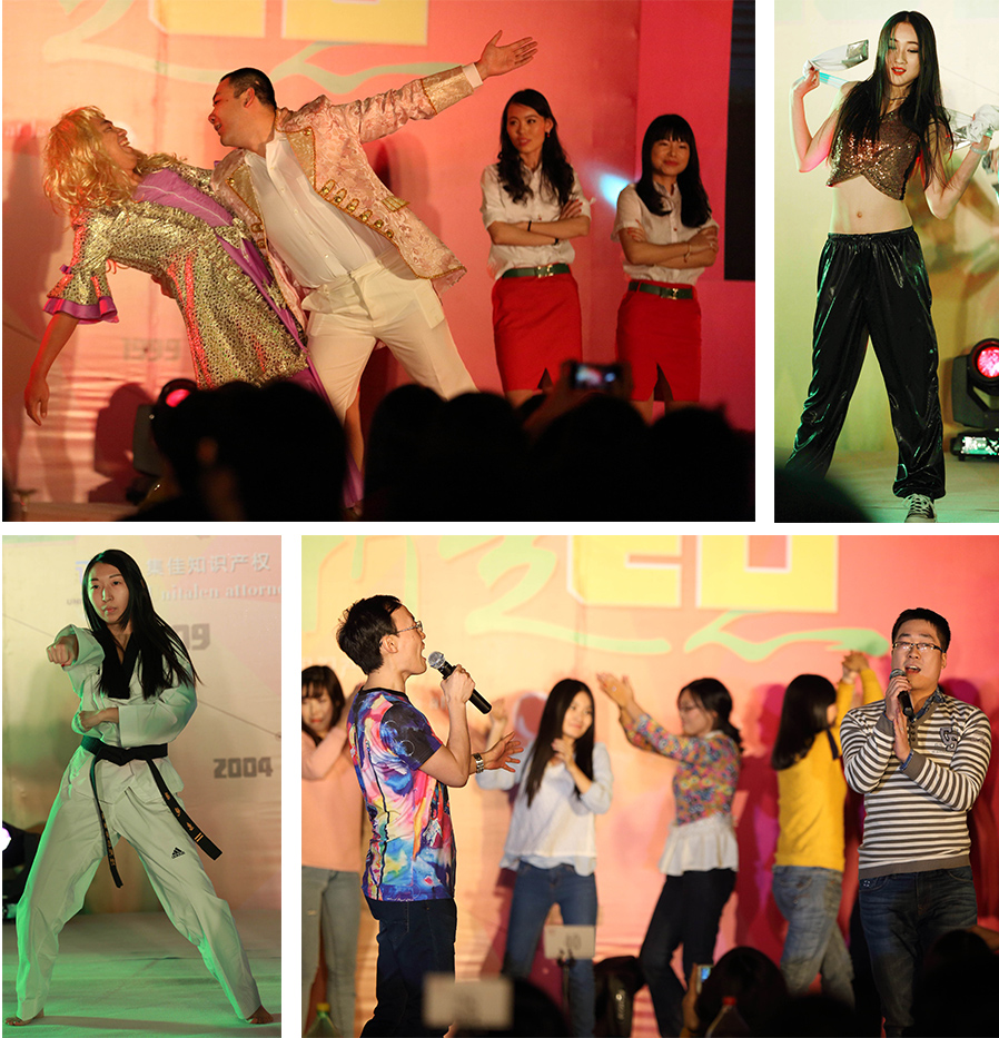 在經(jīng)久不息的掌聲中,集佳20年年會(huì)會(huì)議部分圓滿結(jié)束,一曲熱情洋溢的《奔跑》活力開(kāi)場(chǎng),十幾位青年才俊“歌神”跳上舞臺(tái),熟悉的旋律,高亢的領(lǐng)唱,歌聲很快感染了全場(chǎng)?!都?,對(duì)你愛(ài)不完》、《小雞舞》、《小蘋果》、《動(dòng)感現(xiàn)代舞》紛紛精彩上演,《歌舞串燒》更有國(guó)外客戶友情出演,還有穿越大戲《步步蛇精》,匪夷所思的故事情節(jié)吸引了眾人的眼球,《跆拳道舞》由已獲跆拳道黑帶的流程部同事領(lǐng)舞。集佳合伙人也全力打造三句半《四大才子夸集佳》,作為獻(xiàn)給集佳所有員工的一份禮物。