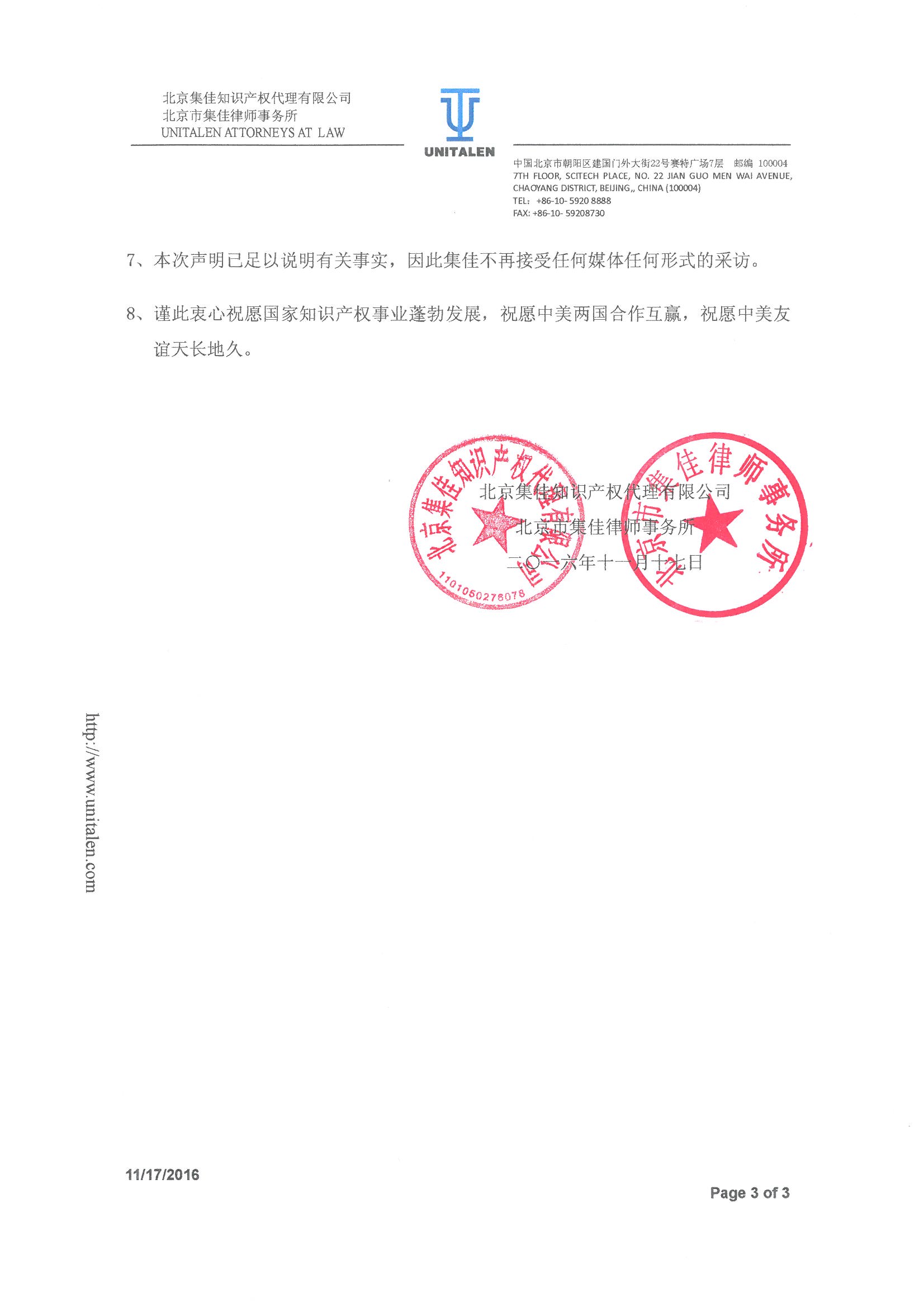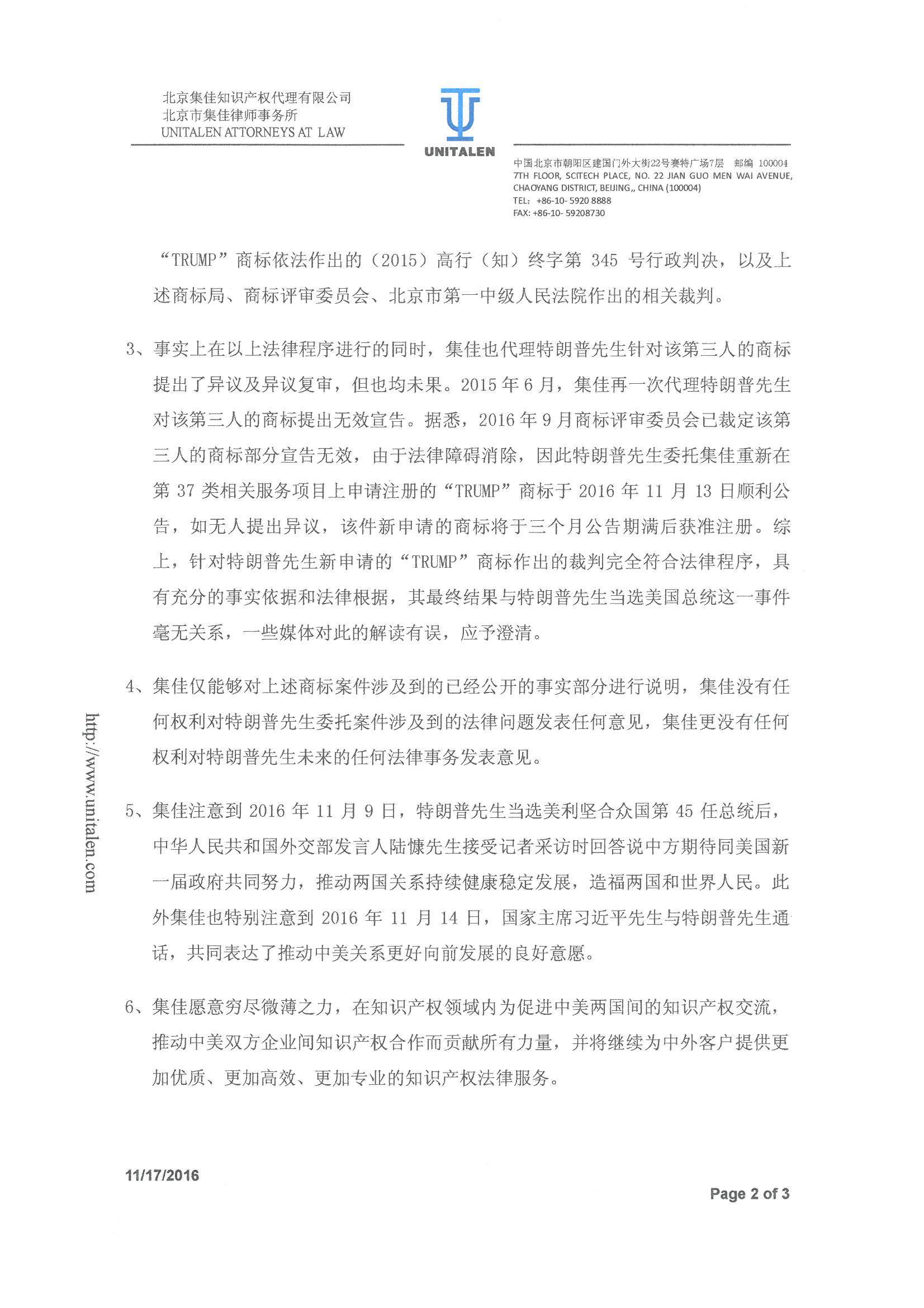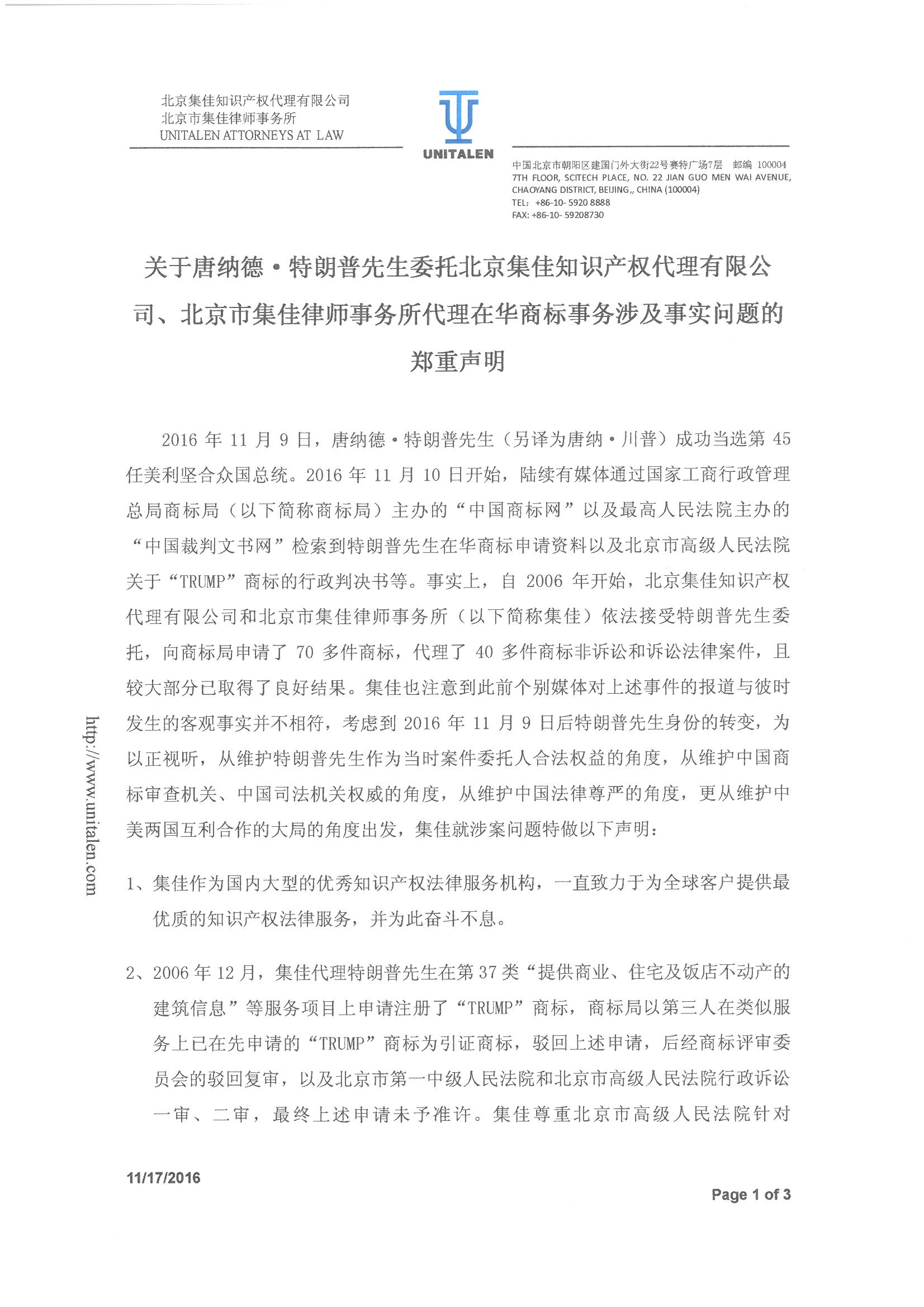 關(guān)于唐納德·特朗普先生委托北京集佳知識產(chǎn)權(quán)代理有限公司、北京市集佳律師事務(wù)所代理在華商標事務(wù)涉及事實問題的鄭重聲明 .pdf