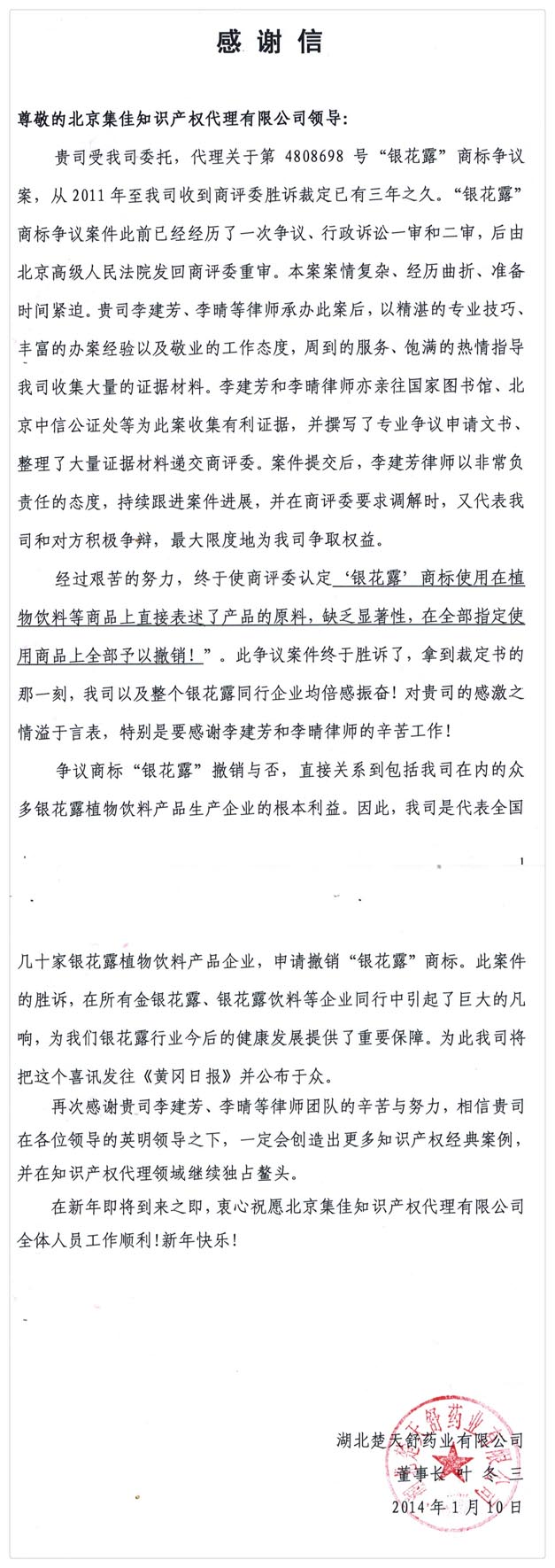 在新年即將到來之際,湖北楚天舒藥業(yè)有限公司給集佳發(fā)來感謝信,并提前祝福集佳全體人員新年快樂,工作順利。 集佳律師曾代理該公司第4808698 號"銀花露"商標(biāo)爭議案獲得全面勝利。該案案情復(fù)雜、經(jīng)歷曲折、準(zhǔn)備時間緊迫,該案的勝訴,在所有金銀花露、銀花露飲料等企業(yè)同行中引起了巨大的凡響,為銀花露行業(yè)今后的健康發(fā)展提供了重要保障。