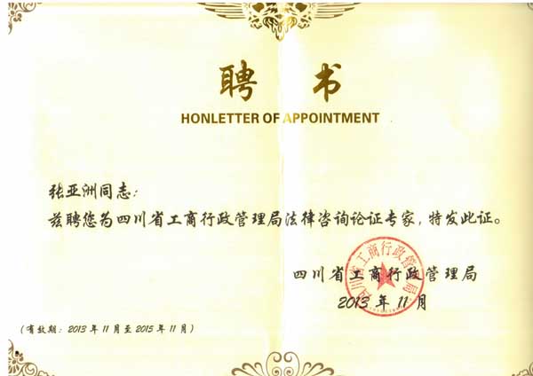 近日,經四川省工商局綜合評議,北京市集佳律師律師事務所張亞洲律師被聘為四川省工商局行政決策法律咨詢論證專家組成員。此次一同受聘的,還包括四川省人大、省政府法制辦、省法院、省公安廳等共11家單位的有關專家學者,集佳律師事務所成為本次受聘唯一的律師事務所。