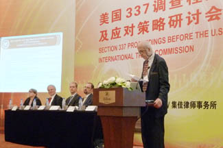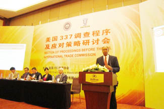 研討會(huì)上,美國國際貿(mào)易委員會(huì)副主席Irving A. Williamson作為第一個(gè)發(fā)言的嘉賓,通過結(jié)合案件實(shí)例,條理清晰地介紹了美國國際貿(mào)易委員會(huì)在美國司法體系中的地位及運(yùn)作的方式,使與會(huì)嘉賓對337調(diào)查訴訟的原則和過程有了宏觀上的了解。緊接著,Whiteford Taylor & Preston律師事務(wù)所的Alex Koff、集佳律師事務(wù)所律師、Adduci Mastriani & Schaumberg律師事務(wù)所的盛茜和Finnegan, Henderson Farabow, Garrett & Dunner律師事務(wù)所的Eric Fues針對國內(nèi)企業(yè)如何應(yīng)訴的疑惑,從辯護(hù)律師的角度詳細(xì)闡述了在立案、舉證、辯護(hù)過程中的應(yīng)對策略,其演講中透露出的辯護(hù)智慧贏得了全場陣陣掌聲。