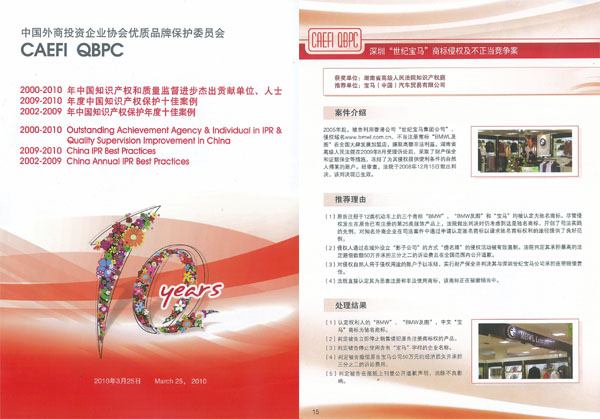 2010年3月25日,在隆重的中國外商投資企業(yè)協(xié)會優(yōu)質(zhì)品牌保護(hù)委員會成立十周年慶典上,由集佳代理的寶馬股份公司訴深圳市世紀(jì)寶馬服飾有限公司(以下簡稱“世紀(jì)寶馬”)等商標(biāo)侵權(quán)及不正當(dāng)競爭一案榮登品保委2009-2010年度中國知識產(chǎn)權(quán)保護(hù)十佳案例。