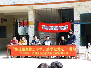 2009-03-17信守著感恩博愛、熱情助人、承擔(dān)社會(huì)責(zé)任的信念,廣州集佳知識(shí)產(chǎn)權(quán)代理有限公司組織員工和東莞辦事處在2009年3月的一個(gè)星期六組織了扶助清新縣石潭鎮(zhèn)雷二小學(xué)的獻(xiàn)愛心活動(dòng)。