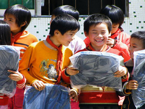 集佳向雷二小學(xué)捐贈(zèng) 拿到新書包的小學(xué)生