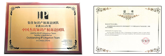 由《中國知識(shí)產(chǎn)權(quán)》雜志與中國日?qǐng)?bào)知識(shí)產(chǎn)權(quán)頻道聯(lián)合主辦的“第五屆中國知識(shí)產(chǎn)權(quán)新年年會(huì)暨論壇”于2015年1月9日—10日在北京舉行,晚宴上對(duì)“第二屆中國杰出知識(shí)產(chǎn)權(quán)訴訟團(tuán)隊(duì)”進(jìn)行現(xiàn)場頒獎(jiǎng),集佳律師事務(wù)所繼2013年獲得該年度“中國杰出知識(shí)產(chǎn)權(quán)訴訟團(tuán)隊(duì)”獎(jiǎng)之后,再次憑借其五星級(jí)的業(yè)務(wù)能力、專業(yè)能力、研究能力以及團(tuán)隊(duì)凝聚力,榮獲“2014年中國杰出知識(shí)產(chǎn)權(quán)訴訟團(tuán)隊(duì)”獎(jiǎng)。