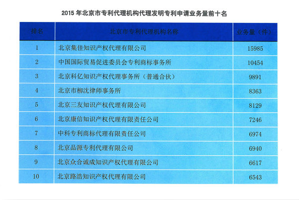 北京市知識產(chǎn)權(quán)局發(fā)布《2015年度北京市專利代理年報》,在北京專利代理機(jī)構(gòu)業(yè)務(wù)排名中,集佳以代理量15985件的成績在發(fā)明專利申請量中再次排名第一,并在專利申請業(yè)務(wù)總量中排名第二。此外,經(jīng)過專家評審,集佳憑借綜合的業(yè)務(wù)能力和優(yōu)質(zhì)的專業(yè)服務(wù),連續(xù)三年入選“北京市優(yōu)秀專利代理機(jī)構(gòu)”。