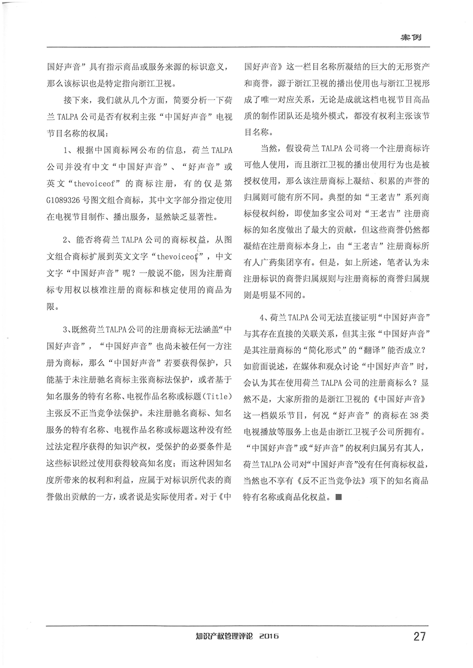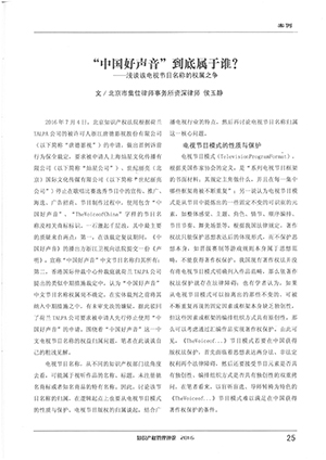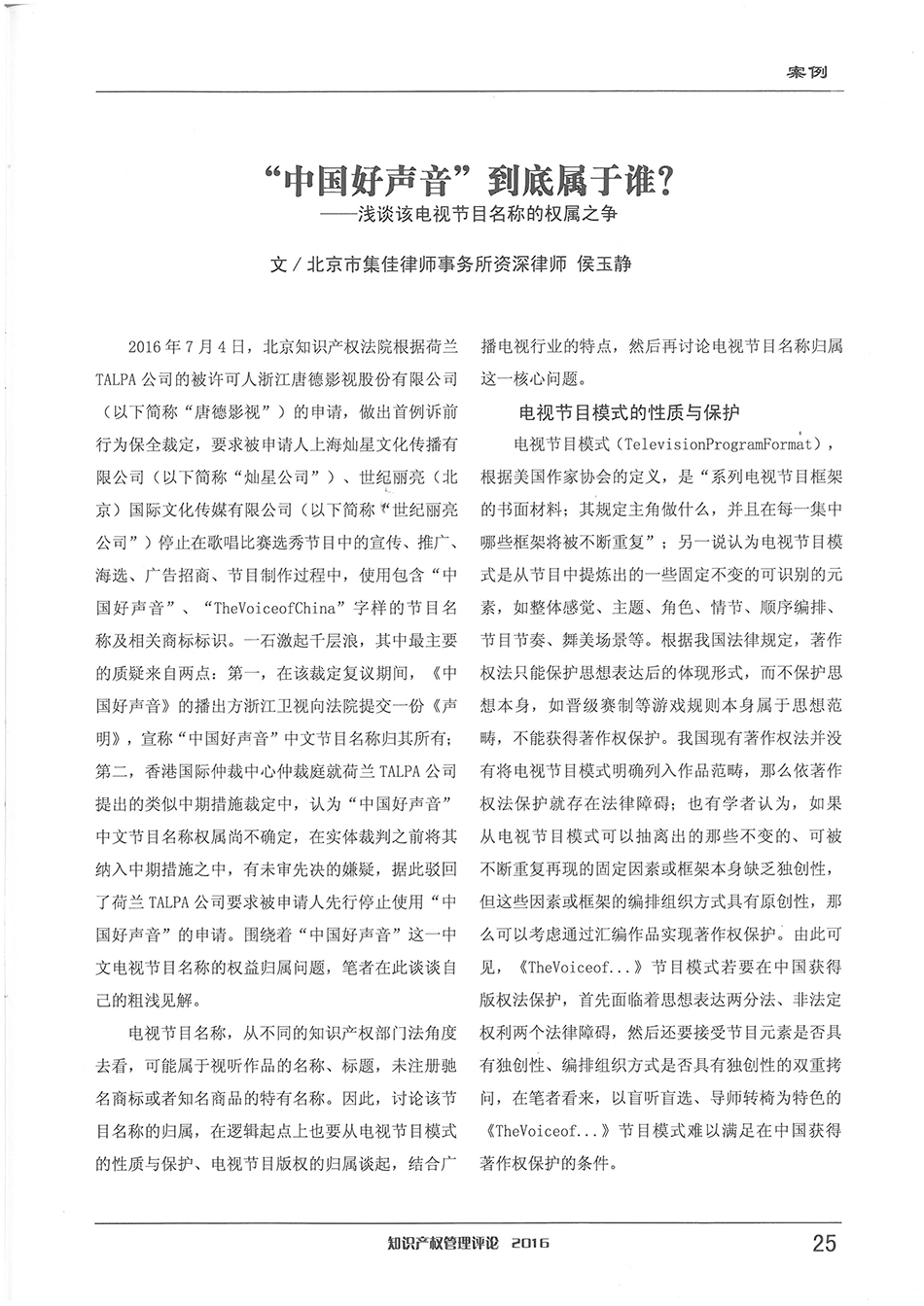 集佳資深律師侯玉靜文章《“中國(guó)好聲音”到底屬于誰(shuí)?——淺談該電視節(jié)目名稱(chēng)的權(quán)屬之爭(zhēng)》在《知識(shí)產(chǎn)權(quán)管理評(píng)論》發(fā)表