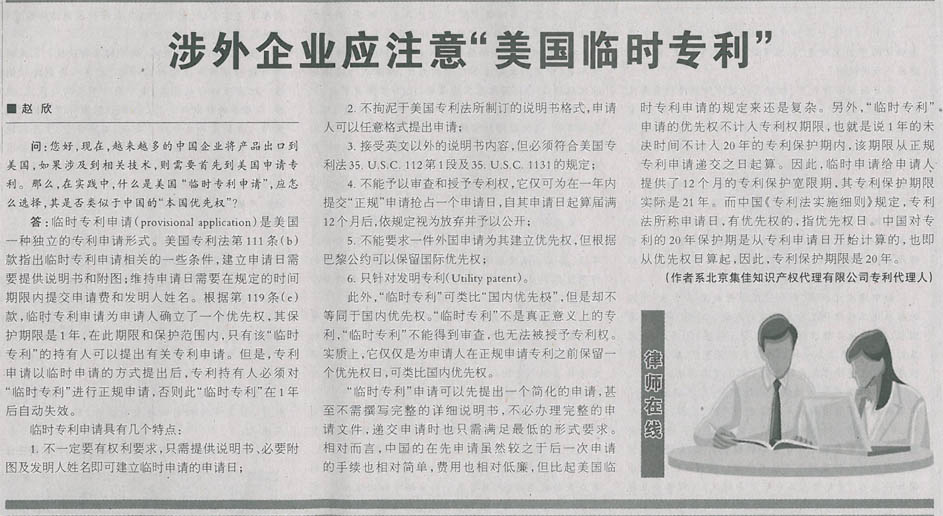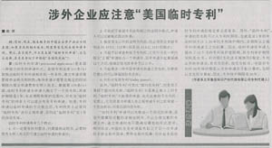 集佳代理人撰文《涉外企業(yè)應(yīng)注意“美國(guó)臨時(shí)專(zhuān)利”》在《中國(guó)貿(mào)易報(bào)》發(fā)表