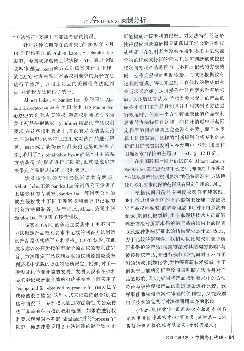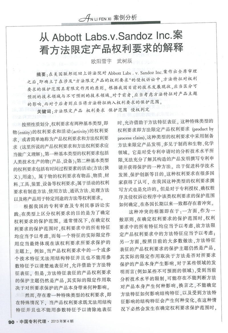 集佳代理人文章《從Abbott Lans.v.SandoZ Inc.案看方法限定產(chǎn)品權(quán)利要求的解釋》在《中國(guó)專(zhuān)利代理》發(fā)表