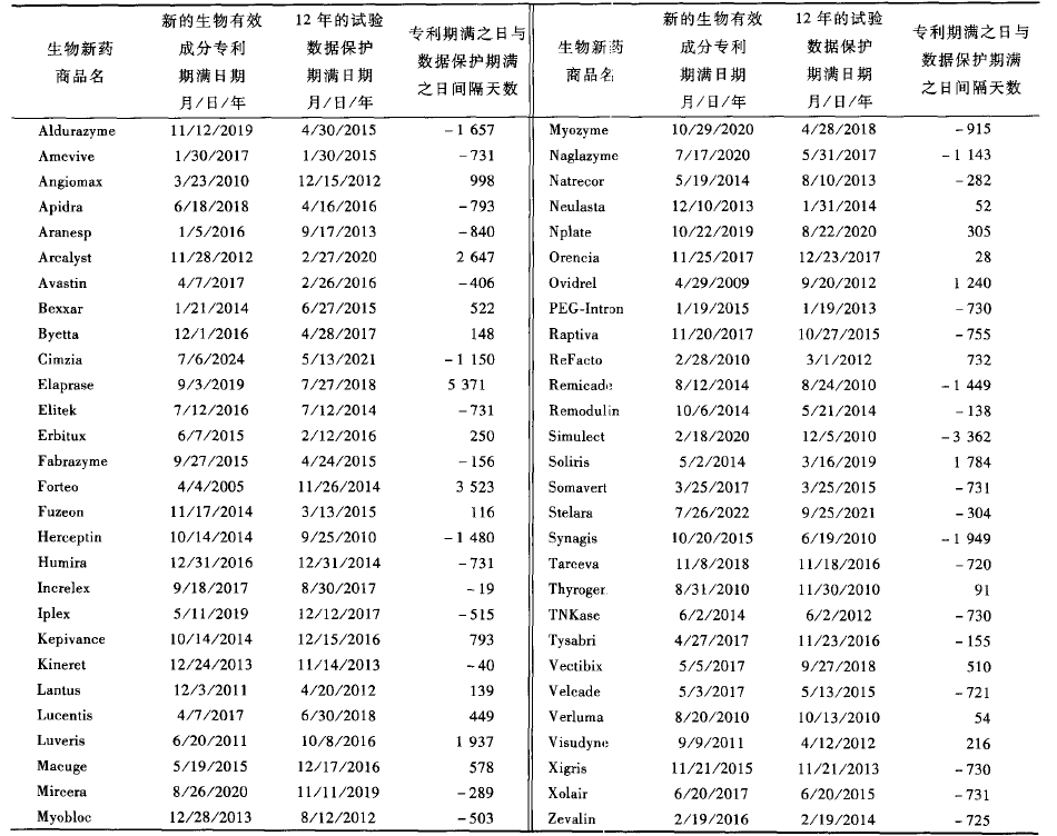 藥品數(shù)據(jù)保護制度,尤其是藥品數(shù)據(jù)獨占權(quán)模式的藥品數(shù)據(jù)保護制度,能夠顯著地彌補專利及其他保護形式的不足,推遲仿制藥的上市,為原研藥繼續(xù)保持合法的市場壟斷地位。眾所周知,專利保護對于原研藥而言是絕對的生命線,但是隨著研發(fā)新藥的難度和投資成本越來越大,研發(fā)周期越來越長,始終保持不變的20年專利保護期(對于大多數(shù)國家而言)就越來越起到推動原研藥廠商開發(fā)新藥的作用,數(shù)據(jù)保護制度的出現(xiàn)在一定程度上解決了這一矛盾。有研究人員對2010年3月美國《生物技術(shù)制品價格競爭與創(chuàng)新法》(Biologics Price Competition and Innovation Act,BPCIA)頒布后能夠享受數(shù)據(jù)保護的56個生物新藥進行了研究,其中有接近一半的藥物在專利過期后仍然能享受數(shù)據(jù)保護所賦予的市場壟斷地位(見下表),其中最長的接近十年7。