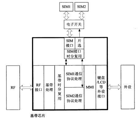 參照上圖,所述單套通信器件實現(xiàn)的雙卡雙待手機包括射頻模塊(RF)、基帶芯片、外設和兩個SIM卡槽(SIM1、SIM2),所述的基帶芯片具有SIM接口時分復用模塊和基帶時分復用模塊,以及SIM1通信協(xié)議處理模塊和SIM2通信協(xié)議處理模塊,所述的基帶芯片通過SIM接口跟一個同時連接兩個SIM卡槽的電子開關相連,并通過片選模塊對電子開關進行控制。從而在一套手機硬件上實現(xiàn)雙卡同時待機,減少了雙卡手機的體積,降低了成本,使用便捷。