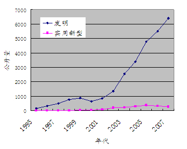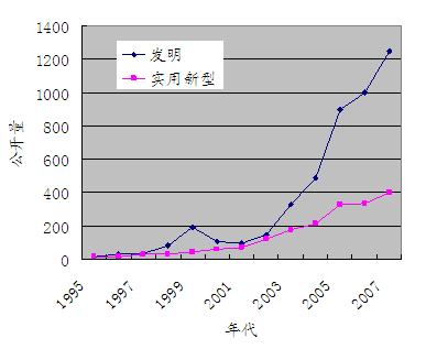 圖2 從1995年以來中國(guó)企業(yè)在中國(guó)申請(qǐng)的專利的公開量的變化