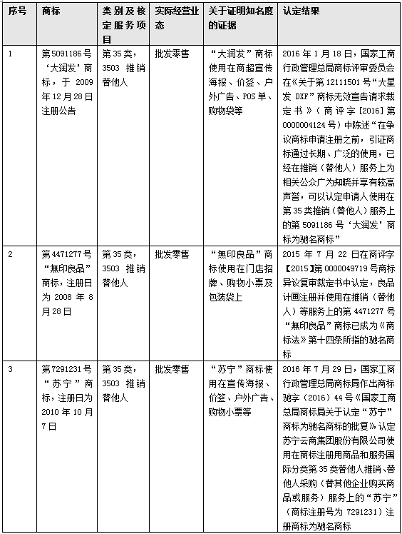 另外,即使在商標(biāo)授權(quán)確權(quán)程序中,對一些案件的裁判結(jié)果與固有的“批發(fā)零售和推銷替他人不相同不類似”認(rèn)知也相左,以下列舉“大潤發(fā)”、“無印良品”和“蘇寧”三個(gè)行政認(rèn)定馳名商標(biāo)案件為例予以說明?!按鬂櫚l(fā)”是知名的連鎖超市品牌,其權(quán)利人在2009年12月在第35類第3503類似群“推銷(替他人)”服務(wù)項(xiàng)目上注冊第5091186號“大潤發(fā)”商標(biāo),后在批發(fā)零售業(yè)態(tài)上進(jìn)行了大量使用,2015年基于在批發(fā)零售上使用形成的知名度,第5091186號“大潤發(fā)”商標(biāo)被認(rèn)定為上海市著名商標(biāo),2016年該商標(biāo)被原國家工商總局商評委認(rèn)定為馳名商標(biāo)。除此之外,類似情形的還有無印良品和蘇寧兩案。