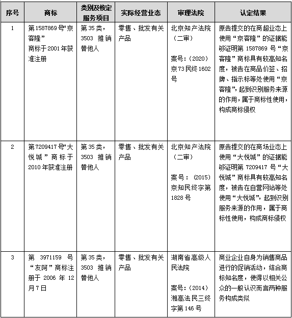 但對于熟悉商標(biāo)授權(quán)確權(quán)程序和商標(biāo)民事侵權(quán)訴訟的代理人而言,一個(gè)耐人尋味的現(xiàn)象是2011年至今全國各地法院審理的商標(biāo)民事侵權(quán)訴訟認(rèn)定結(jié)果卻與上述系列商標(biāo)行政訴訟認(rèn)定結(jié)果大相徑庭,例如:四川高院2011年和廣東高院2014年判決的好又多案【16】,北京知識(shí)產(chǎn)權(quán)法院2015年和2020年判決的大悅城和京客隆案【17】,湖南高院判決的友阿案【18】,山東高院判決的谷子案【19】等均無一例外認(rèn)為批發(fā)零售與推銷替他人構(gòu)成類似服務(wù)。對于這種商標(biāo)民事侵權(quán)與商標(biāo)授權(quán)確權(quán)兩程序中出現(xiàn)的差異,作為審理商標(biāo)授權(quán)確權(quán)行政訴訟的二審法院,北京高院知識(shí)產(chǎn)權(quán)庭在2017年《商標(biāo)授權(quán)確權(quán)行政案件相關(guān)疑難問題的調(diào)研報(bào)告(三)》【20】一文中給予了回應(yīng),其認(rèn)為應(yīng)當(dāng)區(qū)分在商標(biāo)民事糾紛中對商標(biāo)專用權(quán)的保護(hù)和在商標(biāo)權(quán)撤銷復(fù)審行政糾紛中對商標(biāo)專用權(quán)維持有效制度的差異,在商標(biāo)民事侵權(quán)案件中,對商標(biāo)專用權(quán)的保護(hù)體現(xiàn)為“禁用權(quán)”所限定的范圍,其是以法律所規(guī)定的侵害他人注冊商標(biāo)專用權(quán)為基礎(chǔ),以是否會(huì)造成商品的來源混淆為落腳點(diǎn),而發(fā)生混淆的范圍不僅及于注冊商標(biāo)所核定使用的相同商品或服務(wù),也包括了類似商品或服務(wù),而對類似商品或服務(wù)的判斷,是從功能、用途、生產(chǎn)部門、銷售渠道、消費(fèi)群體、服務(wù)對象、內(nèi)容、方式等方面進(jìn)行的認(rèn)知。故商標(biāo)禁用權(quán)的范圍顯然超過了專用權(quán)。