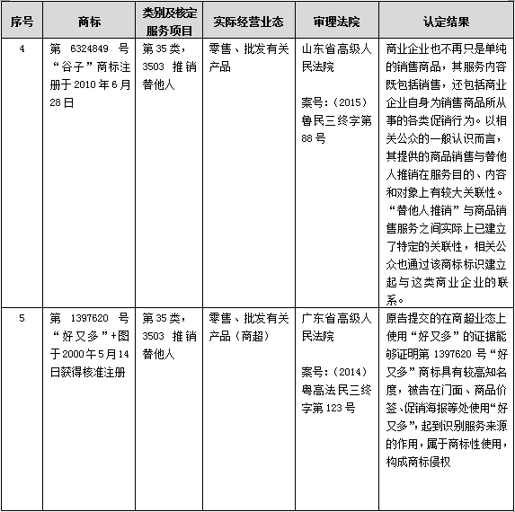坦白地講,由于我國商標(biāo)注冊主管機(jī)關(guān)并未準(zhǔn)予在批發(fā)零售服務(wù)上注冊商標(biāo),因此司法機(jī)關(guān)當(dāng)然也不能越俎代庖。但根據(jù)“大悅城”、“好又多”、“京客隆”等商標(biāo)侵權(quán)案件在司法實(shí)踐中確立的規(guī)則可知,在遵守目前區(qū)分表的既有規(guī)定以及尊重商標(biāo)授權(quán)確權(quán)行政主管機(jī)關(guān)獨(dú)立行使審查權(quán)的情況下,可行的解決方案是,考慮到批發(fā)零售與推銷替他人之間客觀上存在密切的關(guān)聯(lián)關(guān)系,故,基于注冊商標(biāo)禁用權(quán)保護(hù)的需要,將批發(fā)零售與推銷替他人認(rèn)定為類似服務(wù),從而為那些在第35類推銷替他人服務(wù)上已注冊的知名度高、顯著性強(qiáng)的商標(biāo)提供對等保護(hù)。以下是選取的基于“推銷替他人”保護(hù)批發(fā)零售及的案例:
