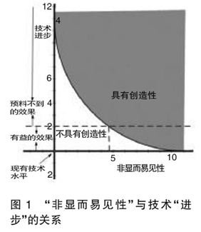 通常,當要求保護的發(fā)明相對于現(xiàn)有技術(shù)的非顯而易見性越低,則對發(fā)明欲具備創(chuàng)造性所需的技術(shù)效果的要求就越高。這一關(guān)系可以簡單地用圖1表示【4】。所以,在效果達不到“量”的預料不到的程度時,可以在進一步限定技術(shù)方案、增加區(qū)別技術(shù)特征的基礎(chǔ)上(由于相關(guān)變量的增加而并非有限次實驗就可容易得到),使該技術(shù)方案的非顯而易見性提高,再結(jié)合“明顯”的優(yōu)異效果,來爭論創(chuàng)造性。