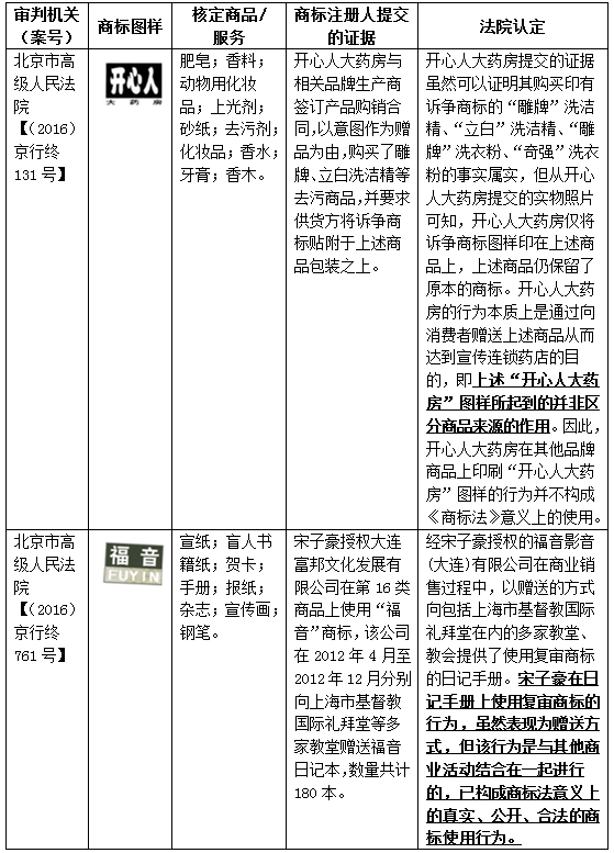 既然國(guó)知局刪除了上述規(guī)定,說(shuō)明將商標(biāo)使用在“贈(zèng)品”上是否構(gòu)成商標(biāo)法意義上的商標(biāo)使用,就需要個(gè)案認(rèn)定。當(dāng)前國(guó)知局對(duì)“贈(zèng)品”的裁判標(biāo)準(zhǔn)可以通過(guò)以下案例窺見(jiàn)一斑: