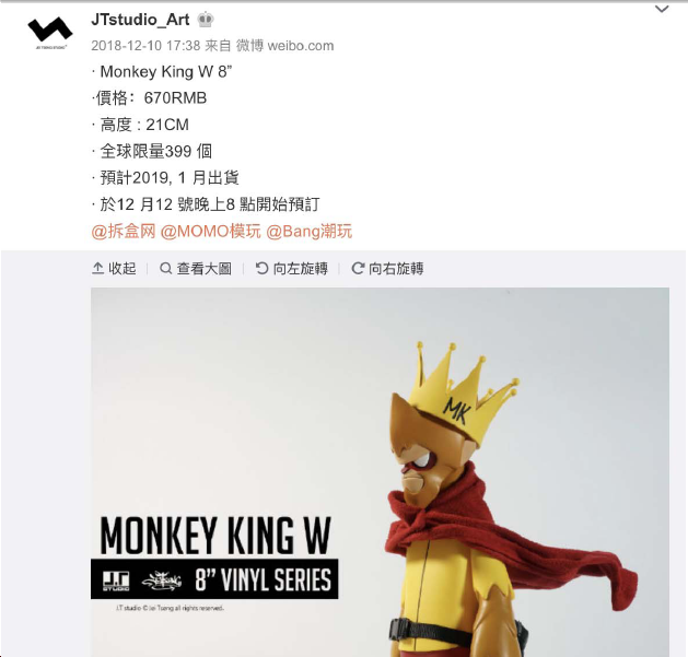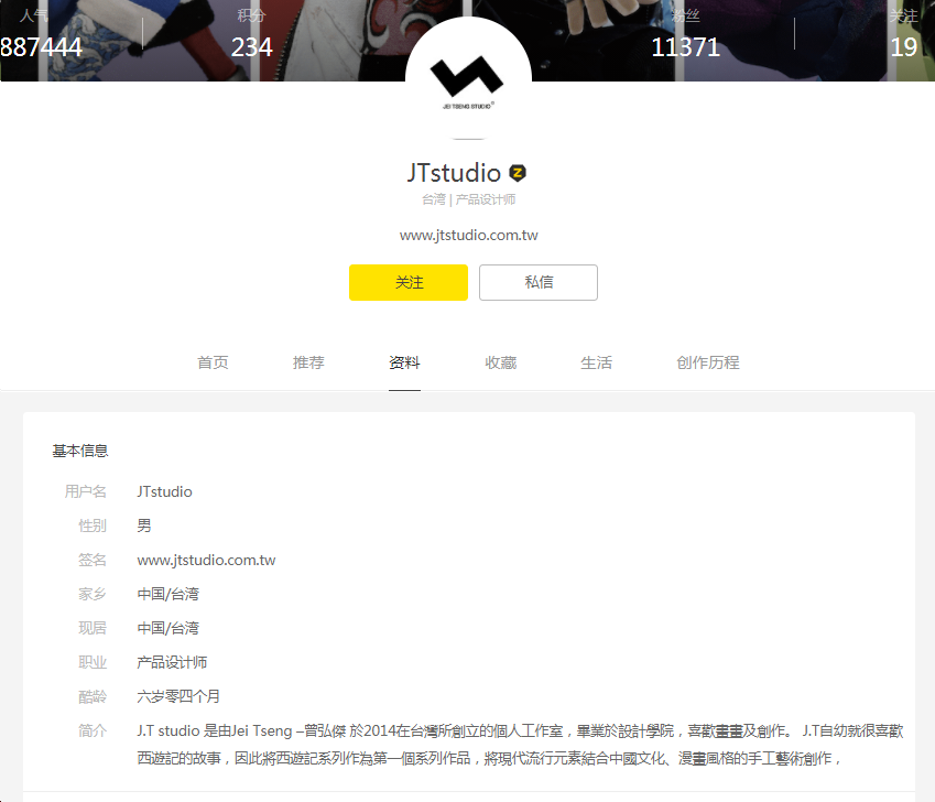 異議人站酷ZCOOL網(wǎng)站的個人主頁(https://www.zcool.com.cn/u/2732656/profile#tab_anchor)顯示,J.T studio是由異議人曾弘杰(英文名Jei Tseng)2014年在中國臺灣所創(chuàng)立的個人工作室,曾弘杰畢業(yè)于設(shè)計學(xué)院,喜歡畫畫及創(chuàng)作,自幼就很喜歡西游記的故事,因此將西游記系列作為第一個系列作品,將現(xiàn)代流行元素結(jié)合中國文化、漫畫風(fēng)格的手工藝術(shù)創(chuàng)作。異議人在站酷ZCOOL網(wǎng)站擁有11371位粉絲,人氣值高達(dá)1887444。