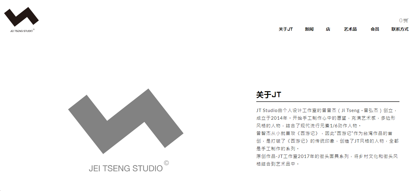 站酷ZCOOL網(wǎng)站中作者主頁顯示個人工作室官方網(wǎng)站為www.jtstudio.com.tw,異議人隨案提供了異議人個人工作室官網(wǎng)打印件,官網(wǎng)首頁顯示如下信息:JT Studio由個人設(shè)計工作室的曾弘杰(Jei Tseng 曾弘杰)創(chuàng)立,成立于2014年。開始手工制作心中的愿望,充滿藝術(shù)感,多邊形風(fēng)格的人物,結(jié)合了現(xiàn)代流行元素1/6動作人物。曾弘杰從小就喜歡《西游記》,因此“西游記”作為臺灣作品的首創(chuàng),是打破了《西游記》的傳統(tǒng)印象,創(chuàng)造了JT風(fēng)格的人物,全都是手工制作的系列。原創(chuàng)作品-JT工作室2017年的街頭面具系列,將鄉(xiāng)村文化和街頭風(fēng)格結(jié)合到藝術(shù)品中。