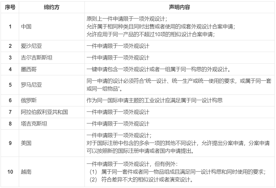 通過海牙體系提交國際注冊申請,一件申請中最多可以包含不超過100項外觀設計,前提是這些外觀設計同屬于同一大類(洛迦諾分類)。不過,并不是所有締約方的法律都放開了合案申請的外觀設計的限制。如果根據(jù)其國內(nèi)法律規(guī)定,不允許就不同外觀設計進行合案或者對合案數(shù)量有所限制,則該締約方必須提前向國際局提出聲明,下列為目前作出聲明的締約方及其聲明的內(nèi)容: