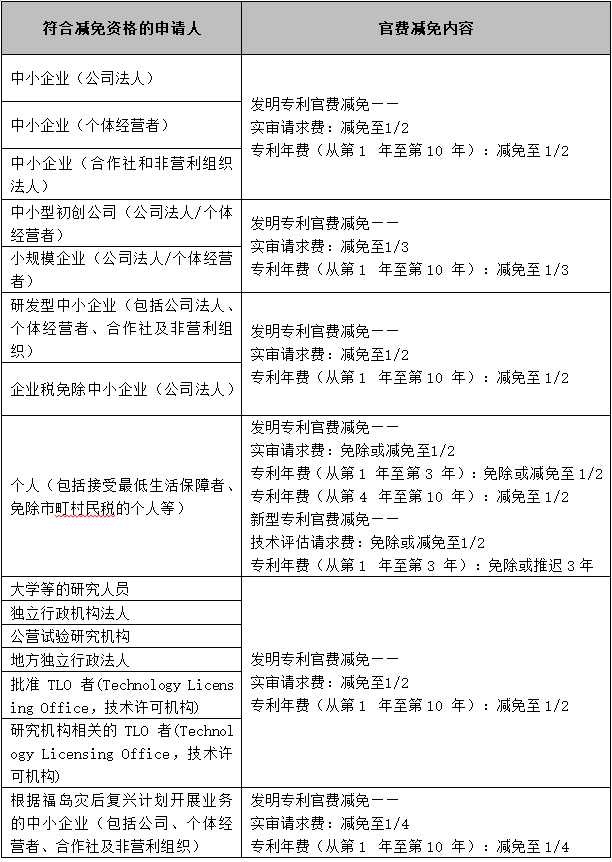 對(duì)于在2019年4月1日之后提出實(shí)審請(qǐng)求的日本發(fā)明專利申請(qǐng),其實(shí)審請(qǐng)求費(fèi)和專利年費(fèi)將按照下表內(nèi)容進(jìn)行減免: