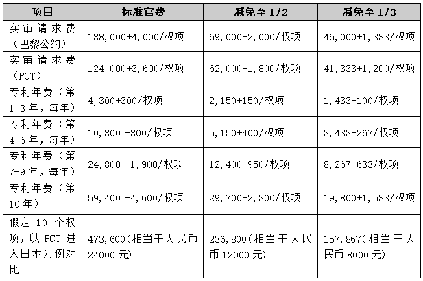 對(duì)于外國(guó)申請(qǐng)人來(lái)說(shuō),其實(shí)審請(qǐng)求費(fèi)和專利年費(fèi)對(duì)應(yīng)日本國(guó)內(nèi)申請(qǐng)人政策如下: