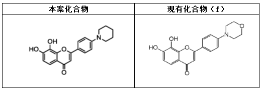 案例1:該案涉及作為TrkB激動(dòng)劑的二羥基黃酮類化合物,該案最主要的化合物和最接近的現(xiàn)有化合物的結(jié)構(gòu)式如下,兩者具有相同的母核苯基二羥基黃酮、用途類似,區(qū)別僅在于本案的苯基上的取代基為哌啶基而現(xiàn)有化合物f為嗎啉基。