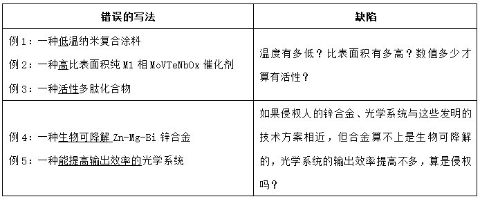下表的示例使用了相對關(guān)系的詞語或該發(fā)明的技術(shù)效果來修飾權(quán)利要求的主題。這些修飾語讓主題讀起來更生動,突出了產(chǎn)品在技術(shù)效果方面的優(yōu)點,作為論文的題目或技術(shù)宣傳不錯,但是,基于下表中所述的“缺陷”,這些用語在權(quán)利要求中是多余的,可能導(dǎo)致權(quán)利要求的范圍不清楚甚至縮小,甚至給侵權(quán)者提供了有機可乘的漏洞。