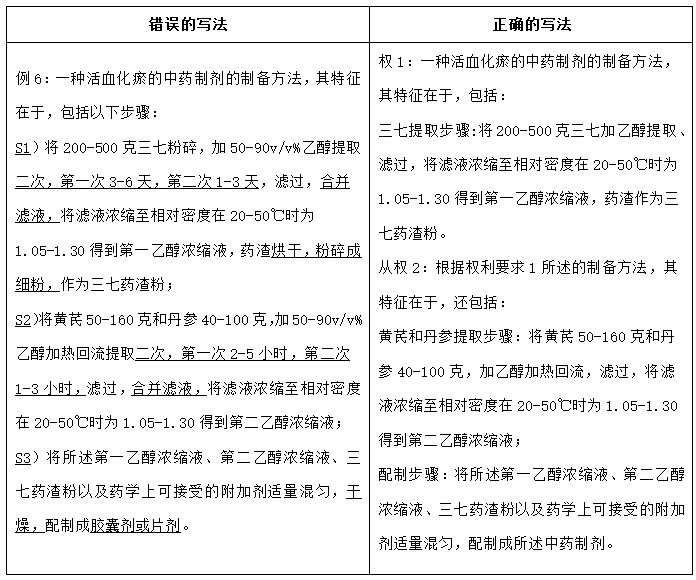 此外,撰寫人應(yīng)知悉,獨權(quán)的技術(shù)特征數(shù)量越多,保護對象的范圍越小。例如,“一種桌子,其特征在于,具有4條腿?!保摍?quán)利要求告訴公眾4條腿的是本發(fā)明的桌子,1~3條腿或5條腿以上的都不是本發(fā)明的桌子;如果寫成“一種桌子,其特征在于,具有4條腿且具有圓形桌面?!?,則進一步限定了4條腿且圓形桌面的才是本發(fā)明的桌子,將桌面是方形等非圓形形狀的排除到了本發(fā)明的范圍之外。所以,要精剪獨權(quán)的技術(shù)特征以構(gòu)建更寬的保護范圍,細節(jié)特征可寫入從權(quán)以構(gòu)建中范圍至窄范圍的退守性權(quán)利要求。例如,對發(fā)明點是將三七藥渣粉作為藥物活性組分的例6的發(fā)明而言,可爭取的最大保護范圍是僅將步驟1寫入獨權(quán)1,其他步驟寫入從權(quán)。