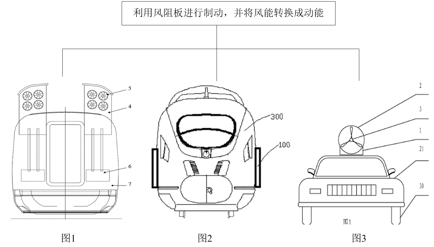 構(gòu)件檢索式(TI=(風(fēng)阻制動(dòng))) AND (IPC=((B61 OR B60)))在DOCDB、CNIPR就檢索到9件與該發(fā)明構(gòu)思相同的專(zhuān)利,但是具體的實(shí)現(xiàn)方式不同,例如專(zhuān)利CN202944357U保護(hù)的技術(shù)方案如圖2所示,具體的“風(fēng)阻制動(dòng)裝置,包括風(fēng)阻制動(dòng)板和驅(qū)動(dòng)機(jī)構(gòu),驅(qū)動(dòng)機(jī)構(gòu)包括驅(qū)動(dòng)桿,驅(qū)動(dòng)桿鉸接于風(fēng)阻制動(dòng)板,風(fēng)阻制動(dòng)板的一端交接于固定座,并由驅(qū)動(dòng)桿驅(qū)動(dòng)而可繞固定座轉(zhuǎn)動(dòng)”。專(zhuān)利WO2012003631A1權(quán)利要求1保護(hù)的技術(shù)方案如圖3所示,具體的“包括車(chē)體、安裝在車(chē)體上的蓄電池、和右蓄電池提供電能的電動(dòng)裝置、與蓄電池電連接的涵道風(fēng)力發(fā)電裝置,隨車(chē)輛的快速行駛產(chǎn)生合流風(fēng)進(jìn)行風(fēng)力發(fā)電,并將電能儲(chǔ)存在蓄電池內(nèi)”。
