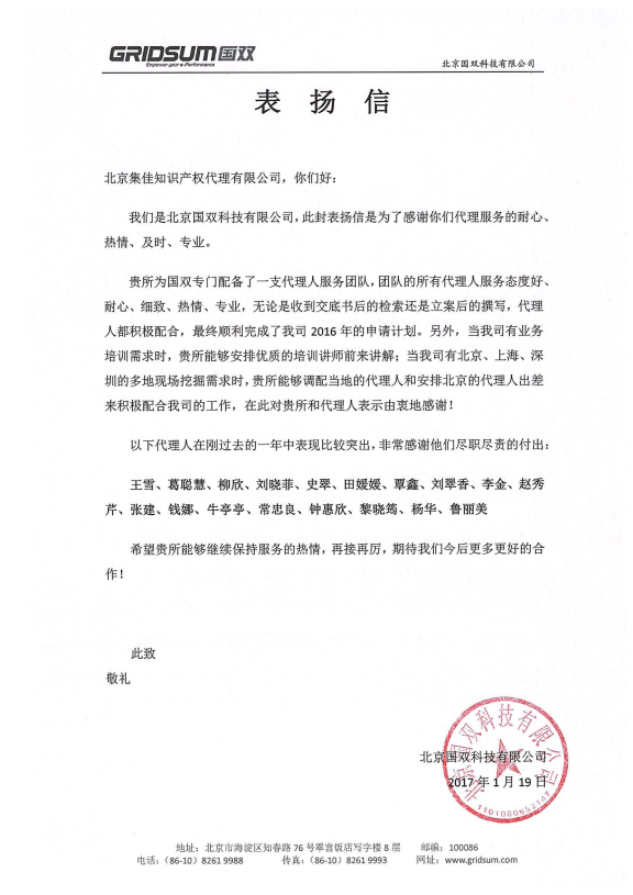 本次發(fā)來(lái)表?yè)P(yáng)信的是北京國(guó)雙科技有限公司,信中,客戶對(duì)楊五、王寶筠等專業(yè)人員的辛勤付出表示感謝,對(duì)集佳專業(yè)高效的服務(wù)、一絲不茍的工作態(tài)度表示認(rèn)可。