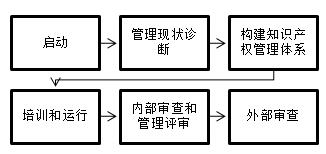 目前貫標(biāo)輔導(dǎo)咨詢,市場份額占比較大的有兩種模式:一種是基于咨詢機(jī)構(gòu)提供的一套符合國家標(biāo)準(zhǔn)的模板,企業(yè)根據(jù)知識(shí)產(chǎn)權(quán)的自身運(yùn)作形成記錄文件后爭取第三方認(rèn)可;另一種,是在咨詢機(jī)構(gòu)的全程輔導(dǎo)下,完成啟動(dòng)、管理現(xiàn)狀診斷、構(gòu)建知識(shí)產(chǎn)權(quán)管理體系、培訓(xùn)和運(yùn)行、內(nèi)部審查和管理評(píng)審、外部審查6個(gè)模塊(見圖1),系統(tǒng)的構(gòu)建知識(shí)產(chǎn)權(quán)管理體系。