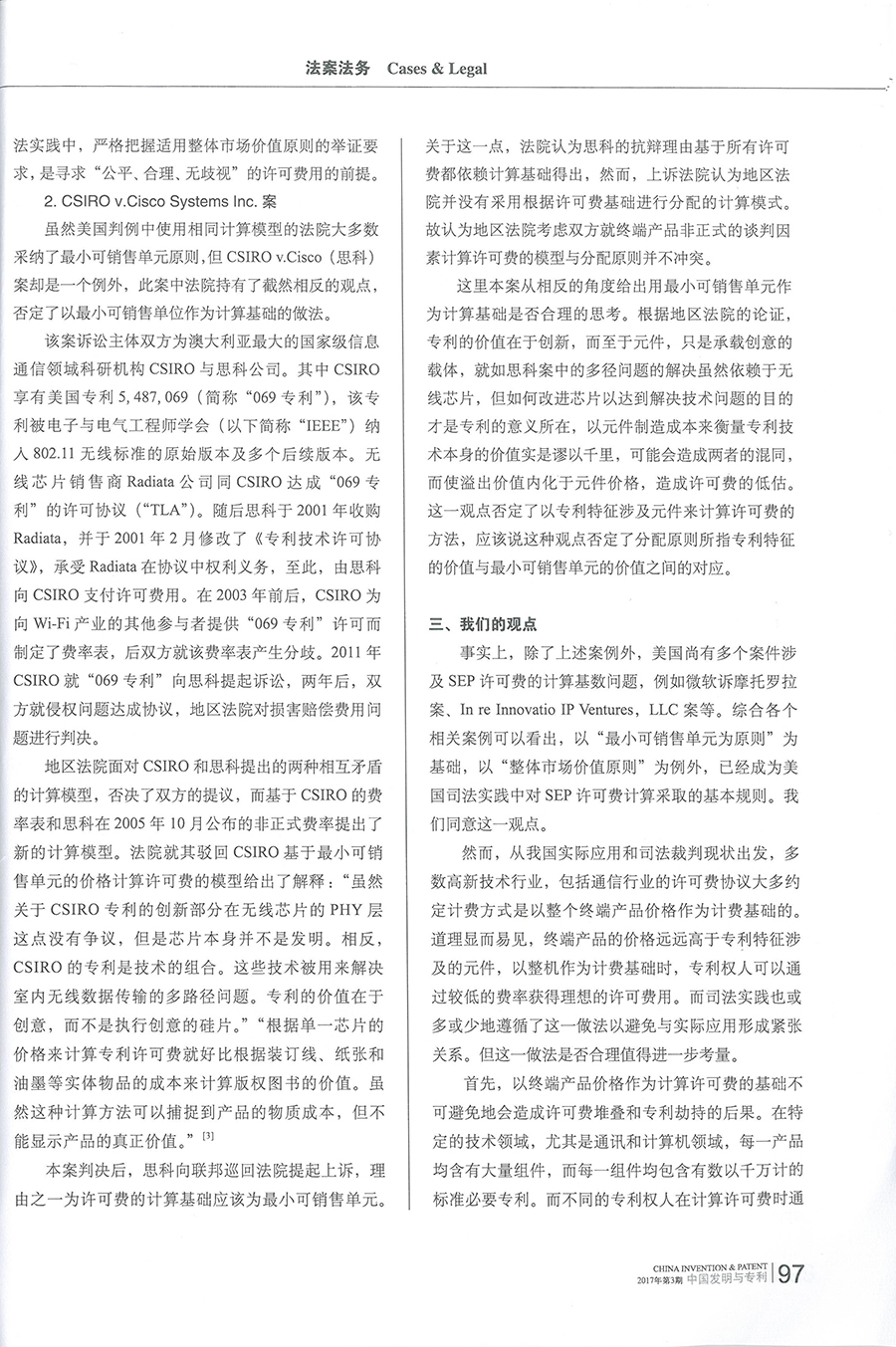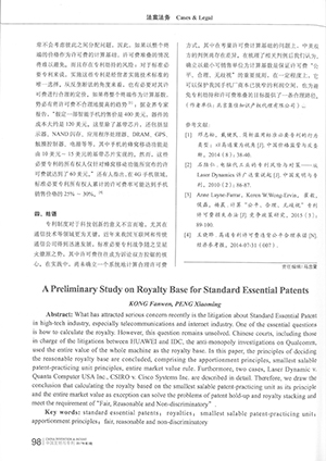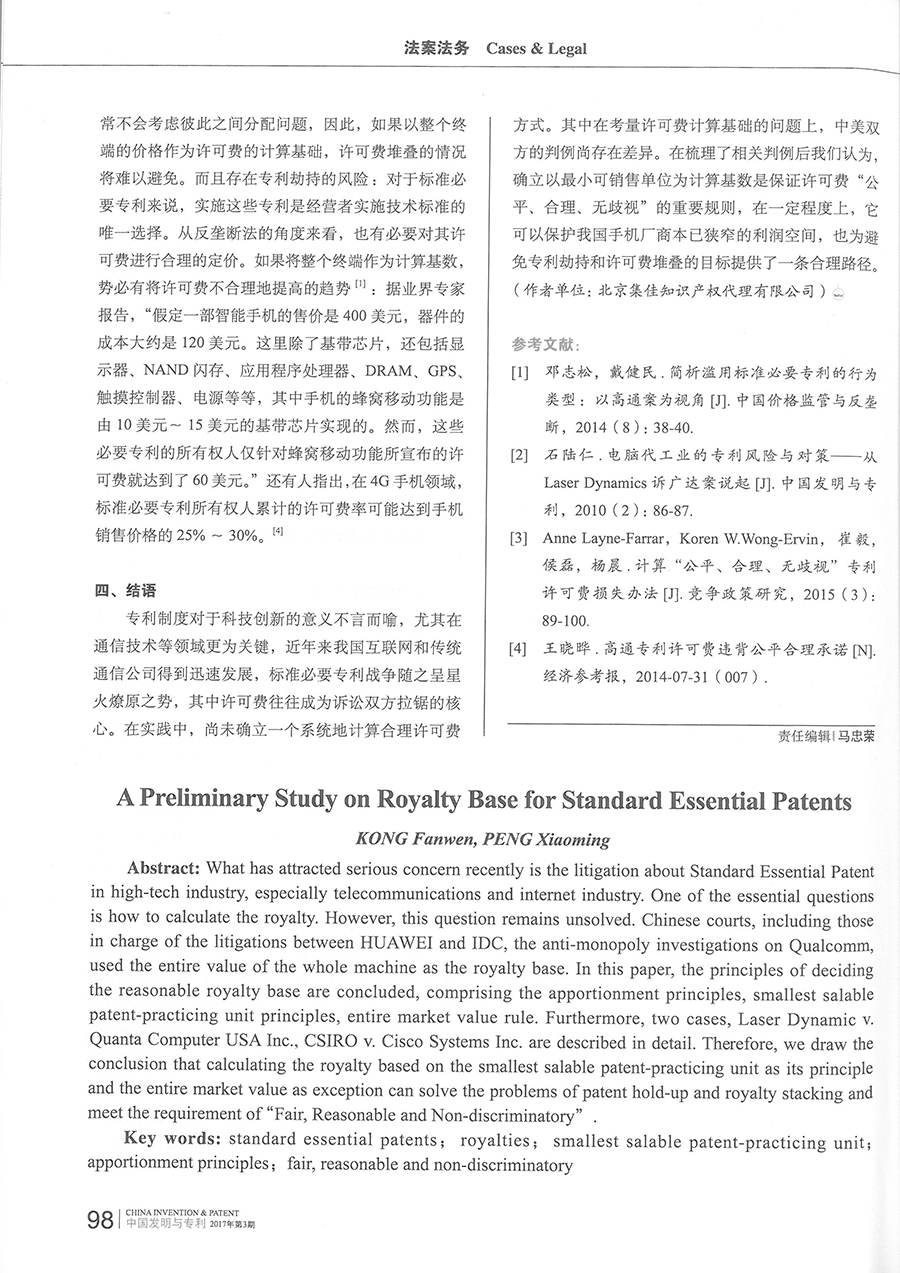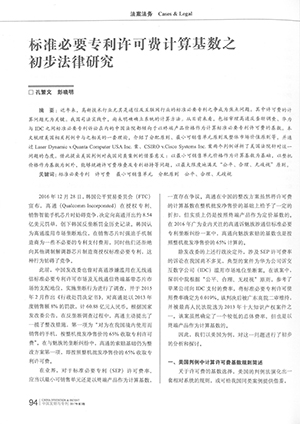 集佳文章《標準必要專利許可費計算基數(shù)之初步法律研究》在《中國發(fā)明與專利》發(fā)表