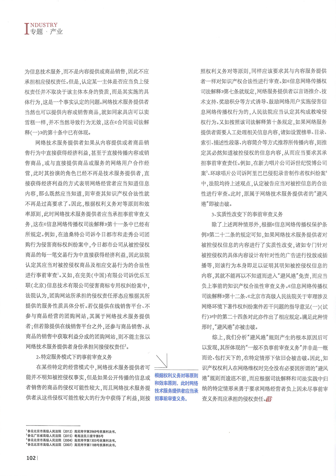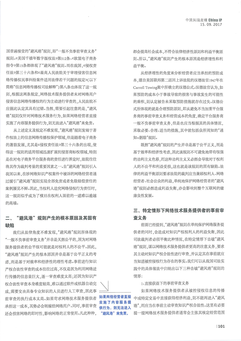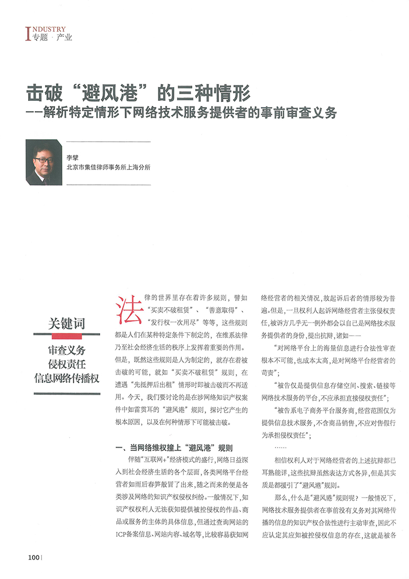 集佳文章《擊破“避風港”的三種情形——解析特定情形下網(wǎng)絡技術服務提供者的事前審查義務》在《中國知識產(chǎn)權》發(fā)表