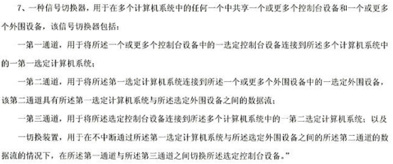 第三,從發(fā)明目的來看,本專利所要解決的技術(shù)問題是提供一種信號(hào)切換器,其在將一個(gè)或多個(gè)外圍設(shè)備切換到不同的計(jì)算機(jī)系統(tǒng)的同時(shí),不中斷流向所述一個(gè)或多個(gè)外圍設(shè)備的數(shù)據(jù)流。而對(duì)比文件1所要解決的技術(shù)問題是提供在多個(gè)USB主機(jī)之間共享外圍設(shè)備,允許多個(gè)用戶使用鍵盤、監(jiān)視器、鼠標(biāo)和一組USB外圍設(shè)備的同時(shí)訪問多個(gè)計(jì)算機(jī),而且同時(shí)支持計(jì)算機(jī)之間的文件傳送裝置,因此,D1中沒有給出關(guān)于上述區(qū)別技術(shù)特征的任何技術(shù)啟示。