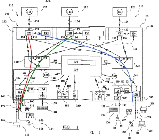 請(qǐng)求人認(rèn)為:D1公開了設(shè)置于USB切換設(shè)備100內(nèi)部的USB切換裝置140、142(兩個(gè)切換裝置對(duì)應(yīng)于涉案專利的特征E的切換裝置),并且,在切換裝置142保持與最左側(cè)計(jì)算機(jī)122以及外圍設(shè)備207連通的情況下(即第二(藍(lán)色)通道不中斷數(shù)據(jù)流),所述切換器140可以通過向下游連接146在最左側(cè)向上游連接144(即第一(紅色)通道)和中間向上游連接144(即第三(綠色)通道)之間切換。
