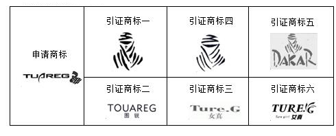 經(jīng)評審認為,申請商標與商標局駁回時所引證的第5110766號圖形商標(以下稱引證商標一)、第4100562號“圖銳TOUAREG”商標(以下稱引證商標二)、第1741769號“女真Ture.G”商標(以下稱引證商標三)、第3882012號圖形商標(以下稱引證商標四)、國際注冊第606861號“DAKAR及圖”商標(以下稱引證商標五)、第9487138號“女真TURE.G Ture gir1及圖” 商標(以下稱引證商標六)在文字構成、呼叫上存在一定差異,未構成使用在同一種或類似商品上的近似商標。依照《中華人民共和國商標法》第二十八條的規(guī)定,最終決定:申請商標的注冊申請予以初步審定。