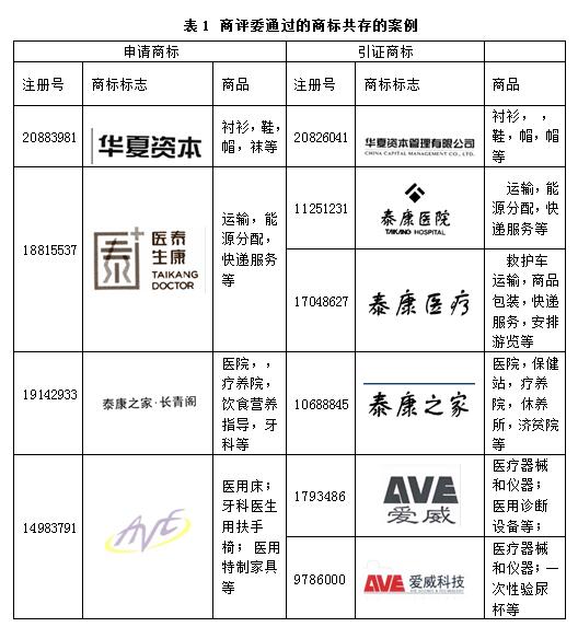 那么究竟多么近似的商標(biāo)可以被商評委準(zhǔn)予共存呢?為了給大家一個(gè)感性認(rèn)識,筆者舉幾個(gè)成功共存的例子供大家參考(請見表1)。