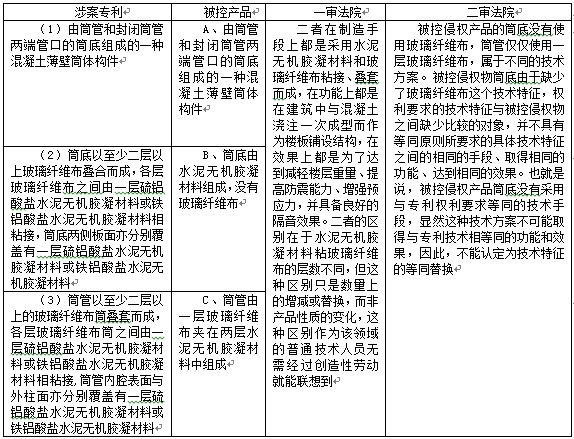 涉案專利權利要求所限定的“混凝土薄壁筒體構件”與巨星南寧分公司生產(chǎn)的薄壁管件的技術特征特征比對如下。該案的焦點問題在于,被控產(chǎn)品技術特征C與涉案專利技術特征(3)相比是否構成等同特征的判斷。也就是說,被控產(chǎn)品筒體的“玻璃纖維布夾”是否為權利要求中記載的管玻璃纖維布層數(shù)為“不少于二層”為等同特征。