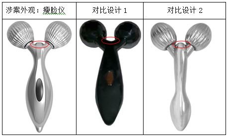 合議組認(rèn)為,用于組合的對比設(shè)計特征應(yīng)當(dāng)是對比設(shè)計中具有相對獨(dú)立視覺效果的組成部分,是以一般消費(fèi)者眼光可直接從對比設(shè)計中自然區(qū)分出來的部分。本案中,證據(jù)2的兩個按摩球中間的凸出部位實(shí)際上是手柄的頂部,證據(jù)2的手柄為一體構(gòu)成,該凸出部分屬于特意劃分、截取所得出的部分,不是一般消費(fèi)者可直接從證據(jù)2中自然區(qū)分獲知的,不能作為設(shè)計特征加以組合。
