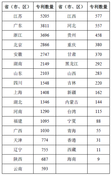 申請專利數(shù)量越多的省市,在該領域相對更加重視,也擁有更好的技術優(yōu)勢。從表2可知,申請量排名前五的省市依次為江蘇(5205件)、廣東(3811件)、浙江(3696件)、北京(2866件)和安徽(2747件),這五省市總計申請了18325件,占據(jù)分析專利總量的半壁江山(49.7%)。申請量前十的省市則占到了分析專利總量的72.9%(26879件),并且西部地區(qū)僅有四川(1548件)躋身申請量前十。