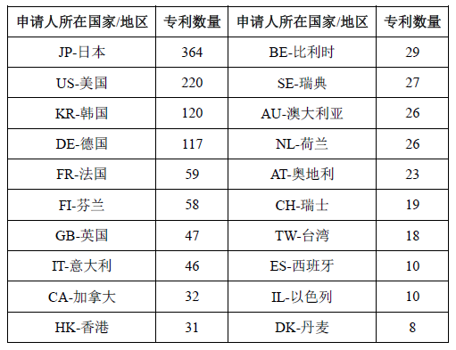 表3 在華申請量分布(申請量排名前20位)