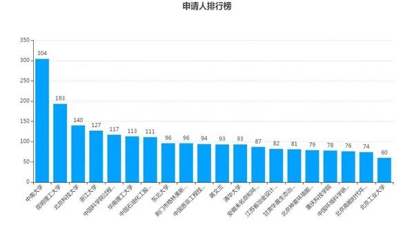 如上分析,在我國固廢領域,國內(nèi)申請人占據(jù)絕對主導地位(96%以上)。從圖3具體來看,除了中南大學(304件)和昆明理工大學(193件)領先較多外,申請量在申請人維度并沒有明顯的集中。注意到前六位申請人均為院校,這表明在整個固廢領域的技術研發(fā)上,高等院校占據(jù)著非常重要的地位。綜合來看,固廢領域的技術創(chuàng)新尚沒有出現(xiàn)絕對的巨頭。