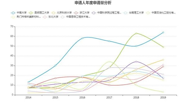 分年度看,如圖5,申請人在近些年的申請趨勢總體變化不大。其中中國石油化工股份有限公司的申請量在2017年達到高峰后,近兩年有所下降;而昆明理工大學在2017年之后、浙江大學和東北大學在2018年之后都有明顯的發(fā)力,這可能表明各個申請人在相應領域的研發(fā)成果有所波動,其更深的后果有待更多觀察。