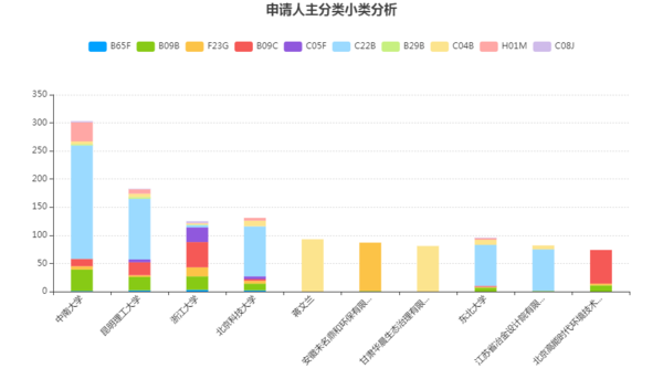安徽未名鼎和環(huán)保有限公司的申請全部為F23G(焚化爐;廢物或低品位燃料的焚毀),這和該公司的主營業(yè)務(生活垃圾熱解)保持一致。浙江大學、北京高能時代環(huán)境技術股份有限公司的專利申請以B09C(污染的土壤的再生)為主。值得注意的是,在本小節(jié)分析的十個主體中,浙江大學的技術分類分散程度最高,顯示出其在多個技術方向上的發(fā)展較為均衡,體現(xiàn)出較強的綜合實力。此外,據(jù)查詢,高能時代公司是土壤修復產(chǎn)業(yè)的龍頭公司,其在污染土壤的再生領域擁有較強的研發(fā)實力。