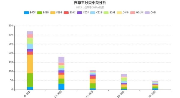 由上文可知,國外申請人在國內(nèi)固廢領域的布局較少,前五個布局國家各自的技術布局如圖7所示。由圖可知,除了日本存在兩個較明顯的優(yōu)勢小類布局之外,其余幾個國家的技術布局雖然各有側重,但均比較分散。與圖2相比,五個國外申請主體中只有美國以B65F(家庭的或類似的垃圾的收集或清除,其在分析專利總量中排名第一)為主,部分反映出美國企業(yè)在固廢收集方面的出海優(yōu)勢。還注意到,日本企業(yè)以F23G(焚化爐;廢物或低品位燃料的焚毀)和B09B(固體廢物的處理)為主進行布局,這與日本在垃圾焚燒和處理方面的技術成熟程度一致。