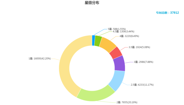 DPI根據(jù)變量對專利進行打分,由高到低依次為5星、4.5星、4星……1星,星級越高,表明專利價值越高。具體地,如圖8所示,3星及以下的專利申請量占比超過80%,4星及以上的占比為13%左右。這可能是由于,如圖1所表明的,分析專利總量的將近80%于近五年內(nèi)(2016年至今)申請,加上審查周期的約束,這些專利的指標在價值評估中的評分可能較低??傮w來看,圖8表明,在固廢領域,大部分專利申請的價值并不高,至少在現(xiàn)階段還沒有表現(xiàn)出較高的價值,這和我國專利申請的總體趨勢吻合。