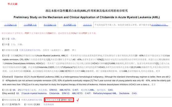 CNKI網(wǎng)頁(yè)顯示的“發(fā)表時(shí)間”并非該論文的公開日。實(shí)際上,CNKI只是將論文首頁(yè)記載的日期(答辯日期)登記為“發(fā)表時(shí)間”,并錄入數(shù)據(jù)庫(kù)中,但并不對(duì)此進(jìn)行核實(shí)。論文首頁(yè)記載的答辯日期類似于送審日期(或收稿日期)。任何一篇文章或論文在網(wǎng)絡(luò)刊物或期刊雜志上公開發(fā)表之前,都會(huì)送審,因而都有一個(gè)送審版本,該送審版本可能是電子版或紙本,該送審版本都需要發(fā)送或遞交給網(wǎng)絡(luò)刊物或期刊雜志聘請(qǐng)的專家進(jìn)行審稿,審稿通過后才能公開發(fā)表。許多網(wǎng)絡(luò)刊物或期刊雜志都會(huì)在發(fā)表的文章中記載送審日期或收稿日期。這些送審日期與發(fā)行日期是不同的日期。例如,“DCAG聯(lián)合HLA不相合的干細(xì)胞輸注治療老年初發(fā)急性髓系白血病的療效觀察”這篇論文的送審日期是2014年4月9日,但是其發(fā)行日期是2015年3月。因此,通常送審日期要早于發(fā)行日期。