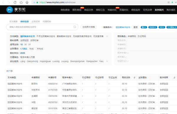 為此,筆者在摩知輪以“肽”為關(guān)鍵字檢索2020年包含“肽”的商標(biāo)駁回復(fù)審決定書,檢索結(jié)果顯示,截止2020年12月3日,共計(jì)出現(xiàn)包含“肽”的商標(biāo)駁回復(fù)審決定書82件,其中80件予以駁回,僅2件通過行政訴訟予以初步審定并公告。在82份駁回復(fù)審決定中,71件以《商標(biāo)法》第十條第一款第(七)項(xiàng)“帶有欺騙性,容易使公眾對(duì)商品的質(zhì)量等特點(diǎn)或者產(chǎn)地產(chǎn)生誤認(rèn)的”條款駁回。