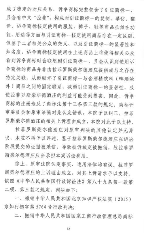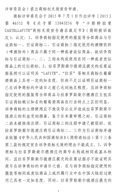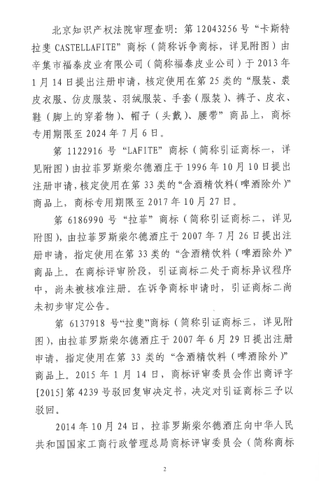近日,北京市高級人民法院就 “卡斯特拉斐CASTEL LAFITE”商標(由辛集市福泰皮業(yè)有限公司在2013年1與14日申請注冊,核定商品為第25類服裝等)無效宣告一案,做出終審判決,認定法國拉菲羅斯柴爾德酒莊在33類酒類商品上在先注冊的“LAFITE”商標,確為公眾所熟知,已構(gòu)成馳名商標;訴爭商標“卡斯特拉斐CASTEL LAFITE”完整包含了在先馳名商標“LAFITE”,且含有的中文“拉斐”是“LAFITE”常用的翻譯形式之一,因此訴爭商標構(gòu)成了對引證馳名商標的復(fù)制、模仿或翻譯,破壞了引證商標與其標示商品之間的固定聯(lián)系,減弱了“LAFITE”商標的顯著性,使拉菲羅斯柴爾德酒莊的利益可能受損。據(jù)此,北京市高級人民法院判決撤銷一審判決及商評委裁定,并責令商評委重新作出裁定。